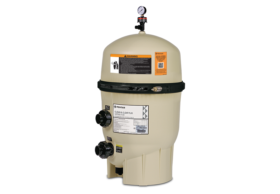 Clean & Clear Plus Cartridge Pool Filters have a corrosion-resistant, injection-molded, fiberglass-reinforced, polypropylene filter tank featuring superior strength and reliability. The cartridge assembly uses four, nonwoven, polyester cartridges. There is no need for backwashing.